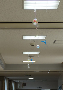 最近暑すぎるので、少しでも涼しく感じてもらいたくて、廊下に風鈴を飾ってみました。