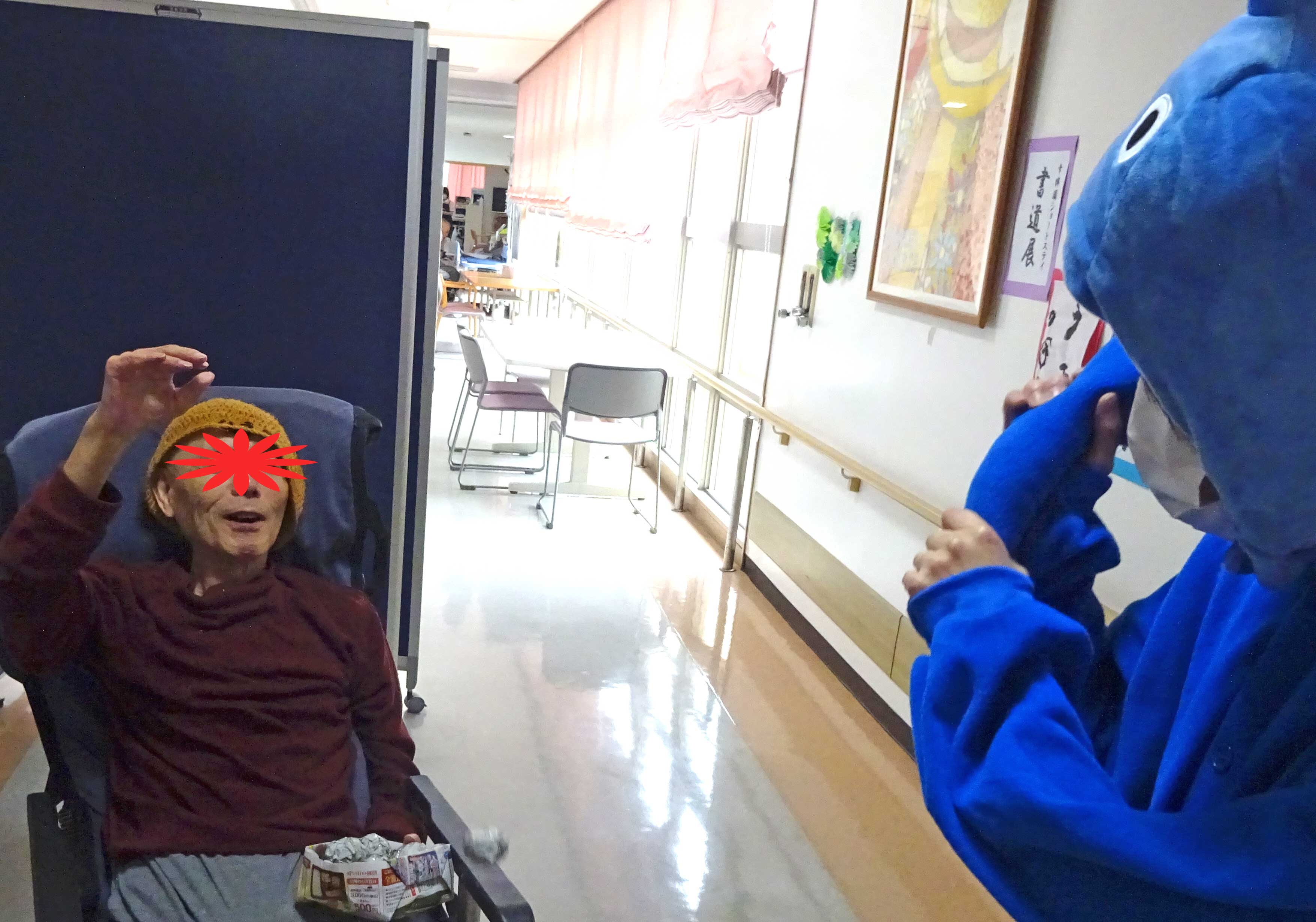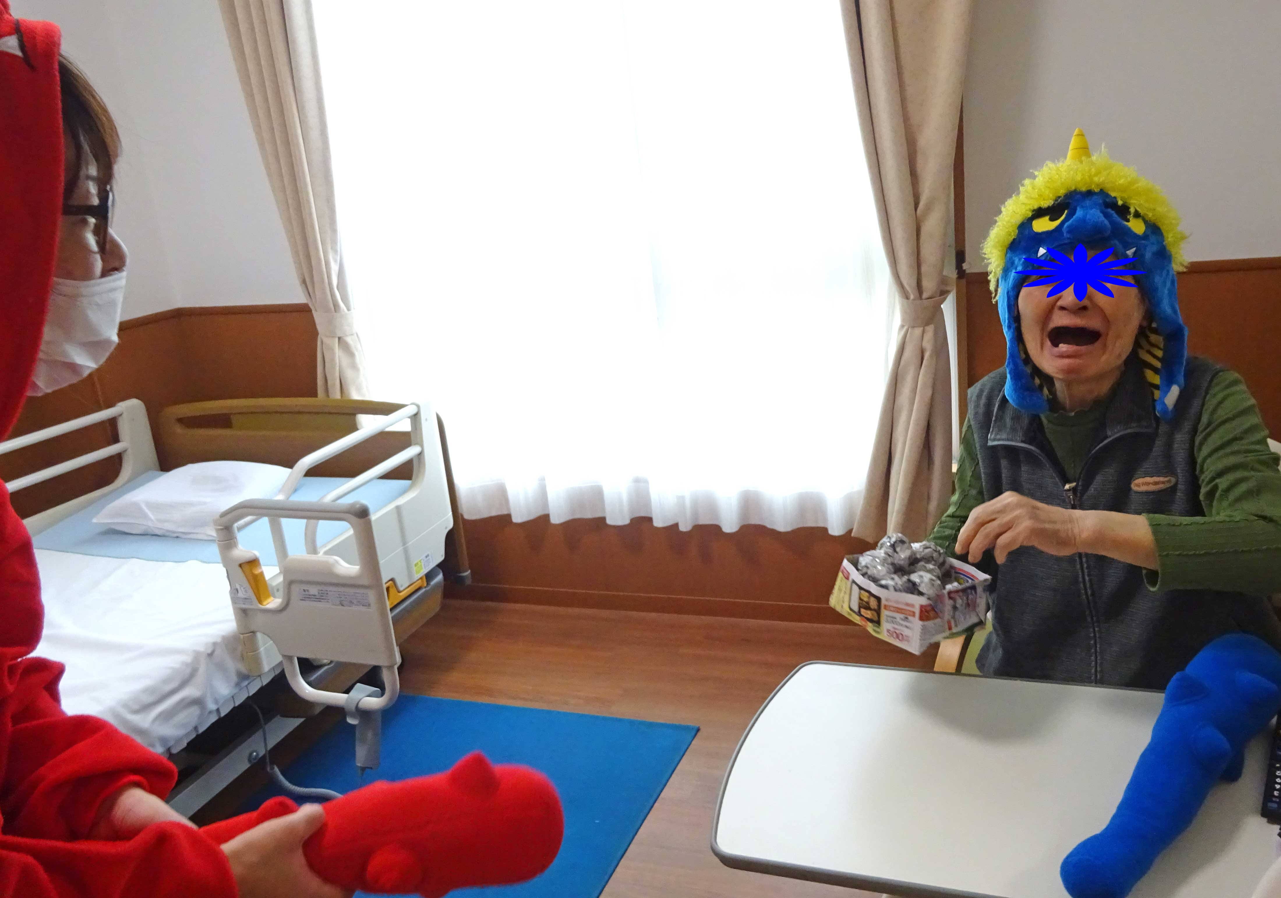 鬼に向かって豆っぽい何か(新聞を丸めた物)を投げてます。