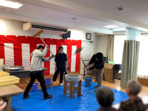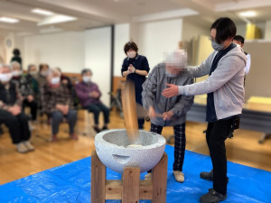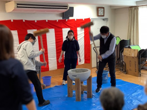 ご利用者様も、体験してみたい方には一緒に餅つきをしていただきました。