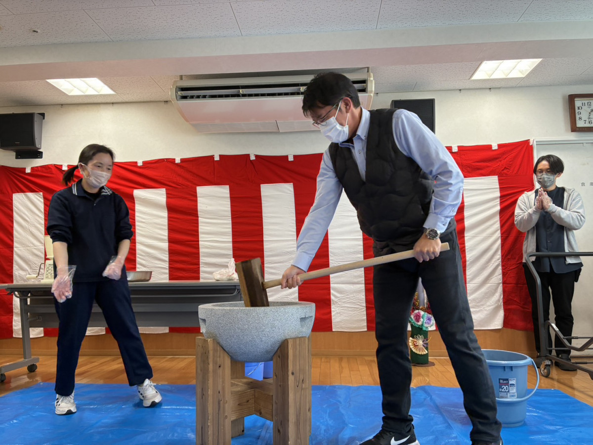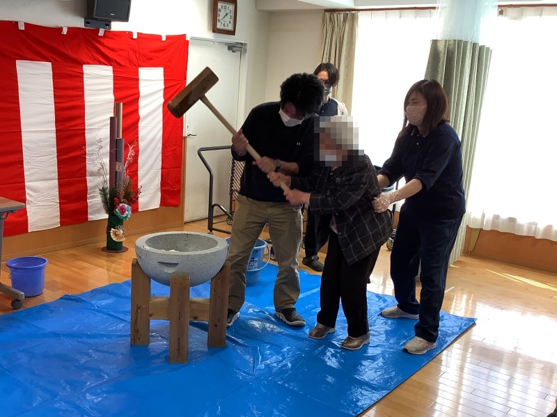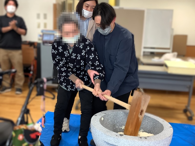 ご利用者様も、体験してみたい方には一緒に餅つきをしていただきました。