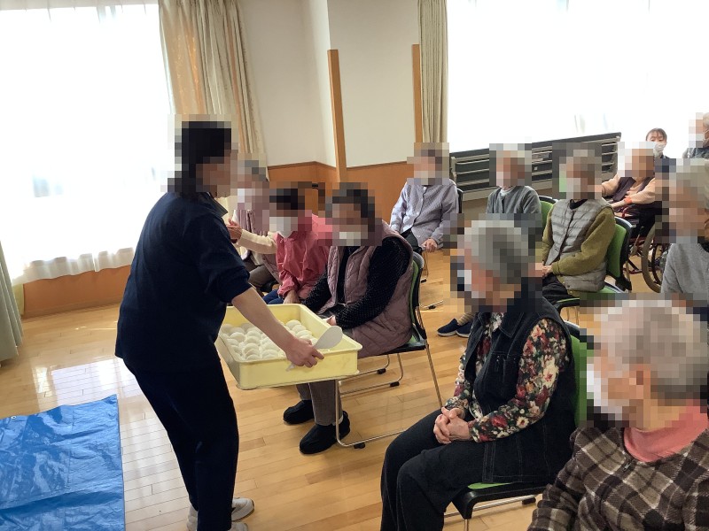 今日はデイサービス・かたらい・ケアハウスの3部署合同で、餅つき大会が行われました。