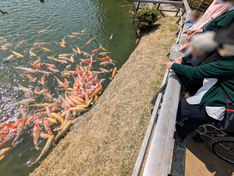 恒例の鯉の餌やりもみんなでしました。たくさん寄ってきてくれて、見ごたえがあります。